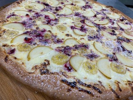 сыр моцарелла, сливки, творожный сыр, банан, груша,брусника, сахарная пудра, джем ягодный.