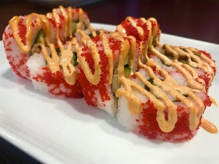 Рис, нори, угорь, креветки тигровые, огурец, тобико, спайси соус.