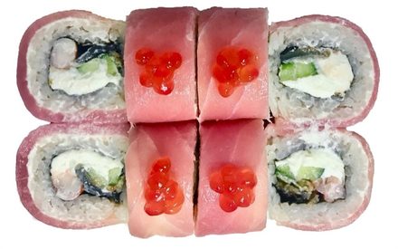 Рис, нори, сыр сливочный, огурец, угорь, креветки тигровые, тунец, икра лосося.