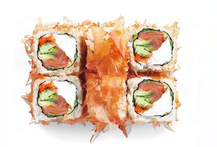 Рис, нори, сыр сливочный, огурец, семга, стружка тунца.