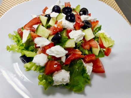 Лист салата, перец болгарский, помидор, огурец, масло растительное, лимонный сок, сыр твороженный, маслины.