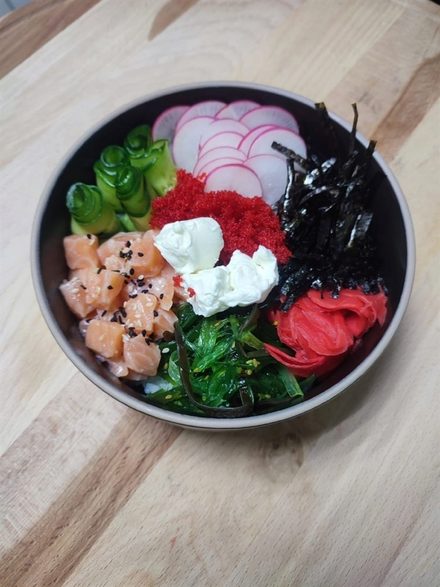 Рис, лосось малосоленый под соком лимона, лист нори, салат чука, имбирь маринованный, икра летучей рыбы, огурец, соус ореховый, сыр творожный, редис.