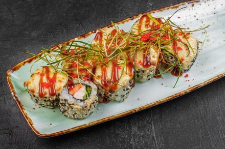 лосось, снежный краб, сыр сливочный, сыр моцарелла, салат айсберг, соус спайс, соус терияки, икра масаго, жареный лук порей.