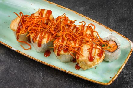 лосось, тигровые креветки, огурец, сыр моцарелла, соус спайс, соус терияки, морковь пай.