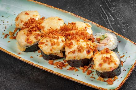 курица копченая халяль, сыр сливочный, сыр моцарелла, огурец, соус спайс, лук фри.