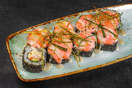 снежный краб,сыр сливочный, сыр моцарелла, огурец, икра масаго, майонез, кунжут, соус ореховый, жареный лук порей.