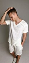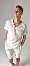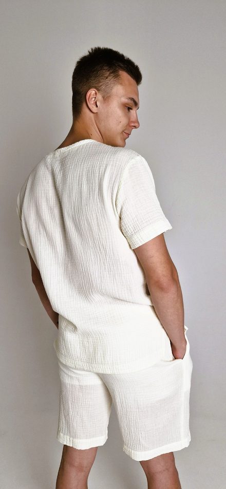 Мужской костюм из 100% хлопка, мягкий и приятный к телу. Хорошо пропускает воздух, не сковывает движения. Не скатывается. Не требует глажки. Мужской костюм из муслина прямого кроя. Шорты с карманами, в поясе резинка. Такой мужской костюм отлично подойдёт для прогулок в тёплую погоду, или для домашней мужской одежды. Можно носить по отдельности, рубашку с джинсами или брюками, а шорты с футболкой. Одежда нашего бренда LV имеет безупречный пошив и идеальную посадку. Мы создаём наши изделия из премиальных тканей, дизайн обновляется достаточно часто, поэтому количество изделий каждой модели ограниченное количество. Успейте приобрести свой размер. С Уважением команда LV!