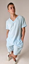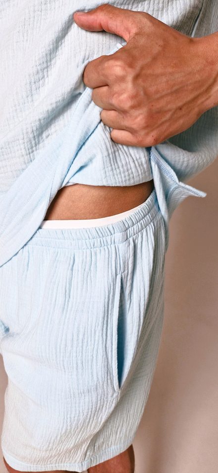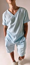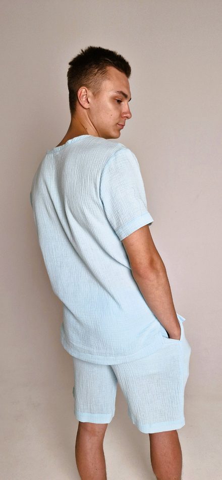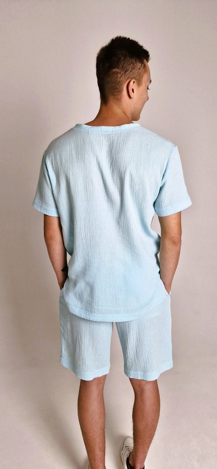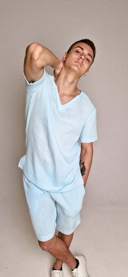 Мужской костюм из 100% хлопка, мягкий и приятный к телу. Хорошо пропускает воздух, не сковывает движения. Не скатывается. Не требует глажки. Мужской костюм из муслина прямого кроя. Шорты с карманами, в поясе резинка. Такой мужской костюм отлично подойдёт для прогулок в тёплую погоду, или для домашней мужской одежды. Можно носить по отдельности, рубашку с джинсами или брюками, а шорты с футболкой. Одежда нашего бренда LV имеет безупречный пошив и идеальную посадку. Мы создаём наши изделия из премиальных тканей, дизайн обновляется достаточно часто, поэтому количество изделий каждой модели ограниченное количество. Успейте приобрести свой размер. С Уважением команда LV!