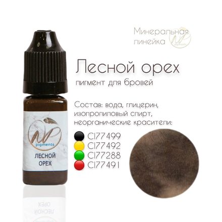 ЛЕСНОЙ ОРЕХ / пигмент для бровей Состав : Состав : вода, глицерин , изопропиловый спирт, неорганические красители : CI77499 CI77492 CI77288 CI77491