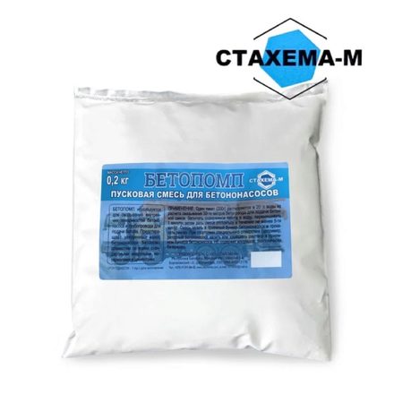 Пусковая смесь Бетопомп выпускается в п/э упаковке по 200 г. Один пакет (200г) растворяется в 20 л воды из расчета смазывания 30-ти метров бетоновода для подачи бетонной смеси.