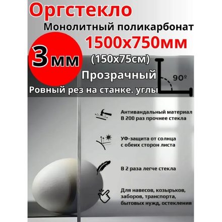 Оргстекло. Поликарбонат монолитный 3мм 1500х750мм, прозрачный (1,125 м.кв.)