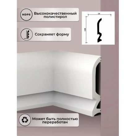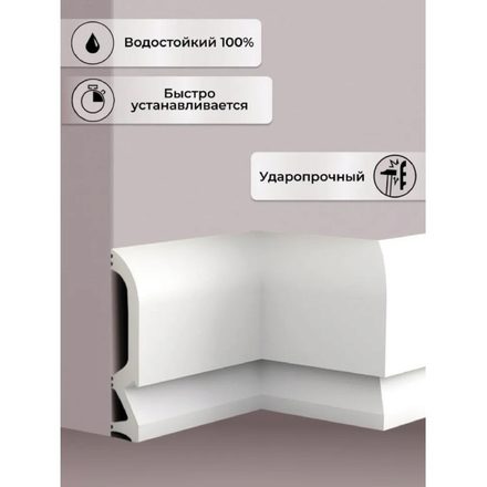 Не требует дополнительной покраски (можно не красить и оставить белоснежным). Изготовлен из полимера высокой плотности и обладает рядом преимуществ:- Устойчив к влажной среде и намоканию, что позволяет использовать плинтус в том числе в ванной комнате и на кухне. Плинтус не деформируется, не разбухает, не ссыхается.- Исключительная ударопрочность, стабильность материала и долговечность.- Абсолютно экологичен, полностью безопасен для здоровья.- Материал не подвержен влиянию плесени и грибка;- Устойчив к перепаду температур;- Можно покрасить в любой цвет без дополнительных затрат на грунтовку или оставить белым.- Монтаж методом запиливания без дополнительной фурнитуры (без уголков, соединителей и заглушек).