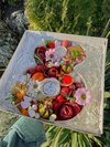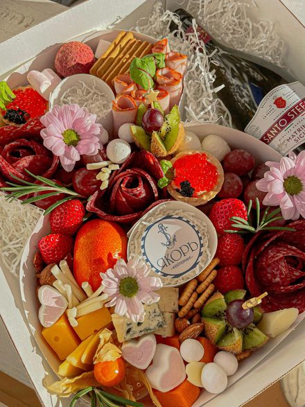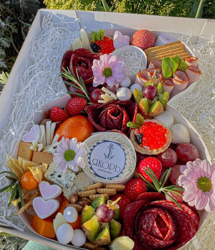 В составе: сыр разных видов, мед, орешки, колбасы, тарталетки с икрой, фрукты