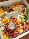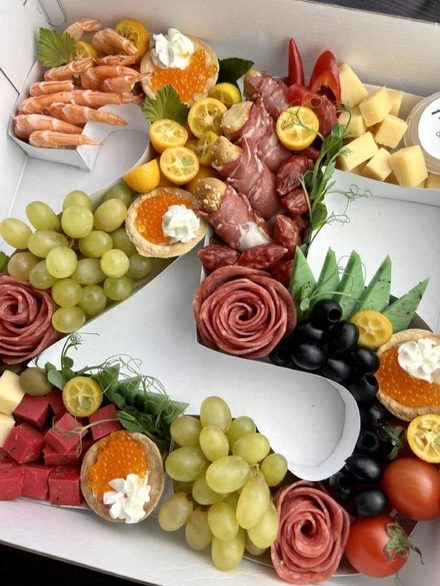 В составе: сыр разных видов, мед, орешки, колбасы, тарталетки с икрой, фрукты