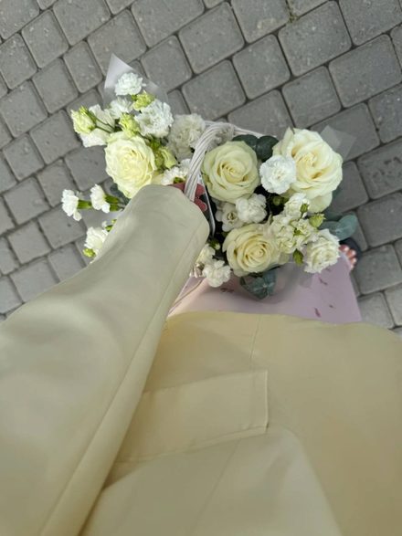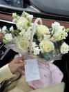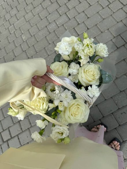 Состав: ветви эвкалипта, Белая одноголовая роза, белая кустовая гвоздика, Фрезия, белая эустома