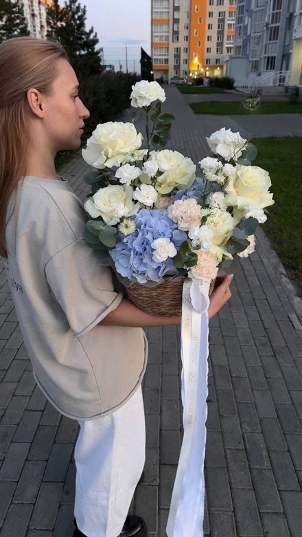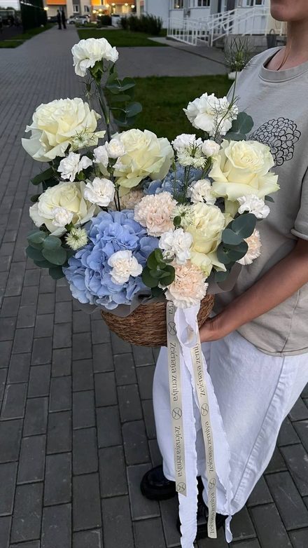 Состав: голубая гортензия, белая Роза Эквадор, белый диантус, диантус брют, кустовая белая гвоздика, нигелла , листья эвкалипта.