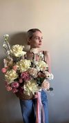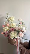 Состав: Белая Роза Эквадор, диантусы брют, кустовая розовая Роза Эквадор, кустовая гвоздика розовая и белая, листья эвкалипта , сухоцветы.