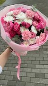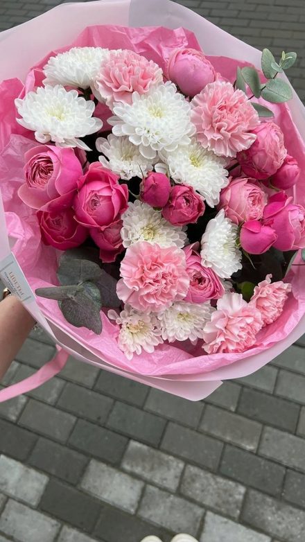 Состав: кустовая хризантема Алтай, кустовая пионовидная Роза, розовый диантус, листья эвкалипта