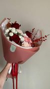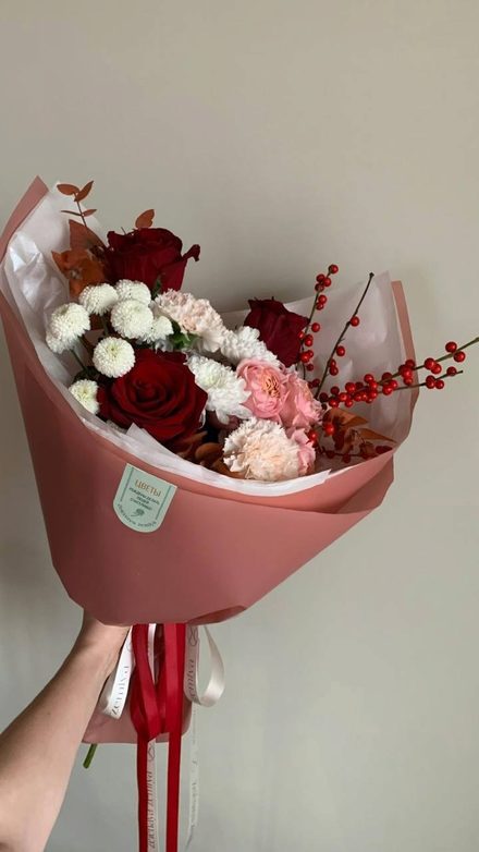 Состав: красная Роза Эквадор, ветки ягодные Илекс, кустовая хризантема Алтай, кустовая хризантема Ньютон, кустовая розовая Роза, диантус брют, листья эвкалипта