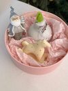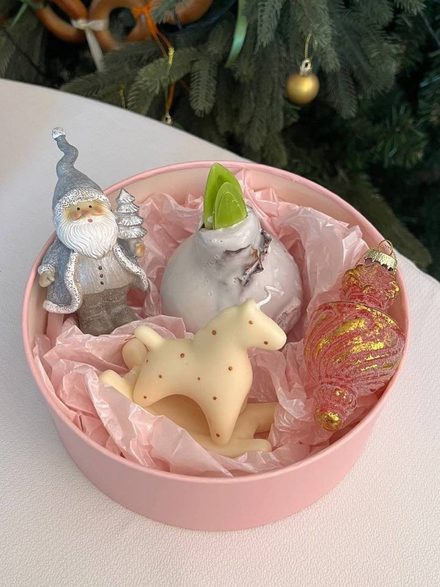 Состав: луковица амарилиса в воске, цвет в роспуске сюрприз🤌🏼 соевая Арома свеча лошадка — символ 2026 года, ароматом хвои и мандарин. Керамическая статуэтка Санта и стеклянная игрушка Колобаш.