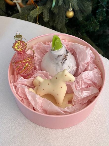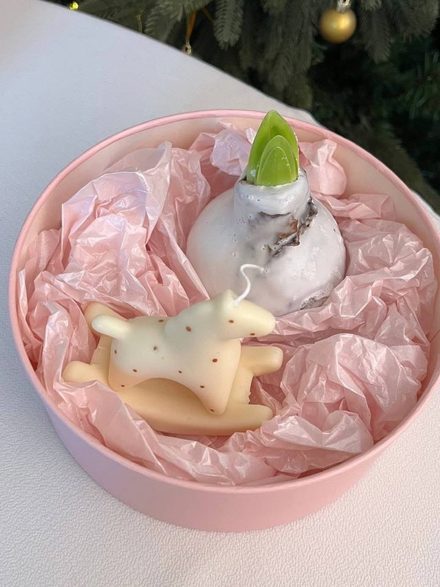 Состав: луковица амарилиса в воске, цвет в роспуске сюрприз🤌🏼 соевая Арома свеча лошадка — символ 2026 года, ароматом хвои и мандарин. И стеклянная игрушка -Колобаш.