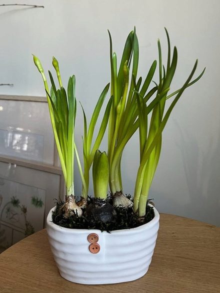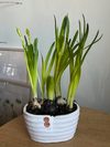 Керамическое кашпо, розовый гиацинт, желтые нарциссы