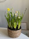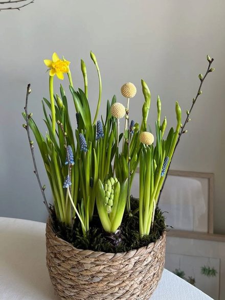 Плетеная корзинка, Гиацинт (цвет может быть: белый, розовый, голубой ); голубые мускари, желтые нарциссы, веточки березы.