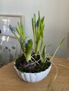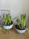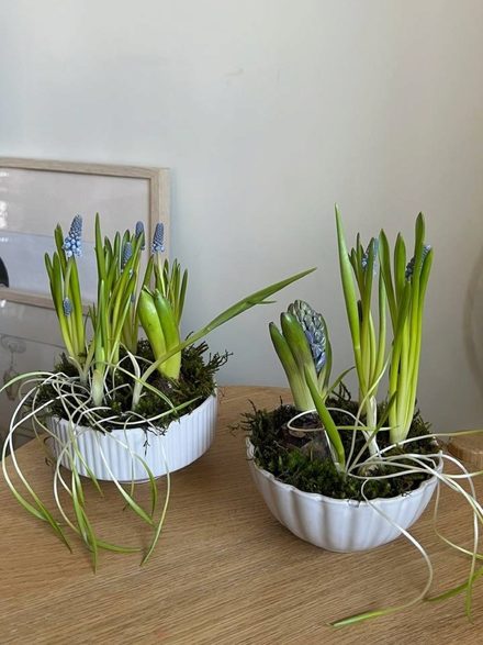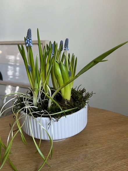 Керамическое кашпо на выбор, гиацинт (цвет на выбор: белый, розовый, голубой), мускари голубые, фритилярия разноцветная.