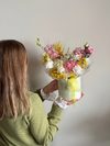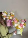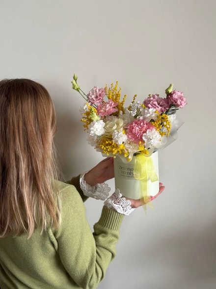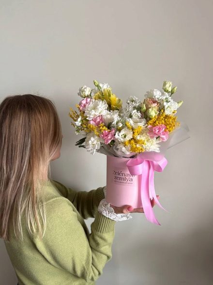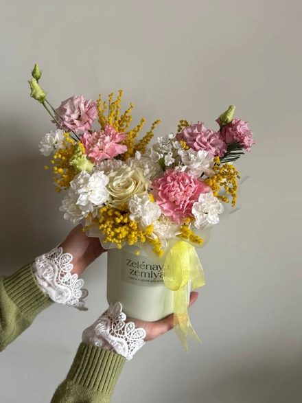 Состав: Желтая мимоза , альстромерия, диантусы, кустовая гвоздика, одноголовая роза Эквадор, белая или розовая на выбор, розовая или белая эустома, кустовая хризантема Алтай, Аллиум или маттиола на выбор.