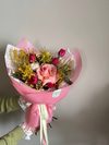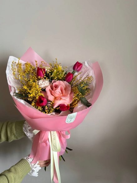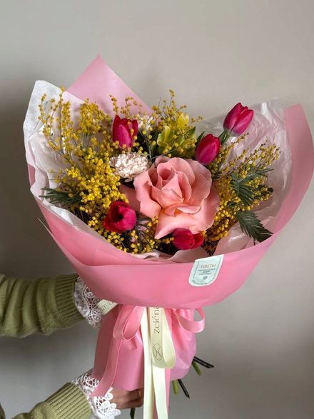 Состав: Желтая мимоза, желтая альстромерия, диантусы, французская Роза Персиковая Эквадор, алые тюльпаны Краснодар