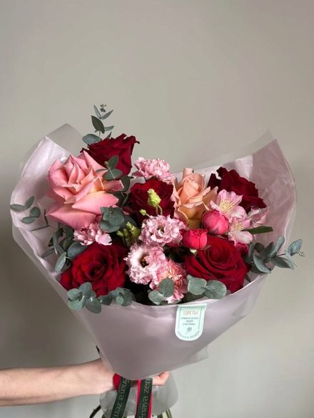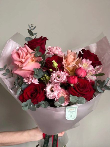 Состав: веточки эвкалипта, французская Роза Эквадор, кустовая Роза Эквадор, розовая махровая эустома, красная Роза Эквадор, розовая кустовая гвоздика, розовый диантус , розовая альстромерия