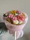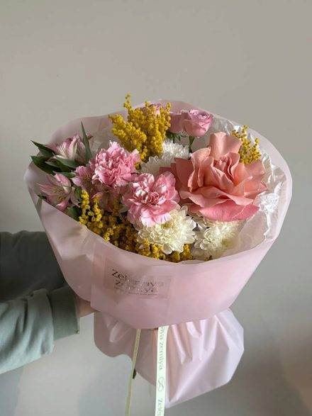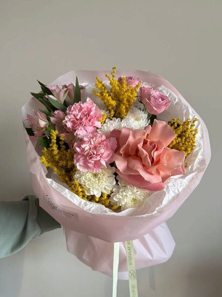 Состав: Желтая мимоза, розовая альстромерия, диантусы, французская Роза Персиковая Эквадор, кустовая хризантема Алтай